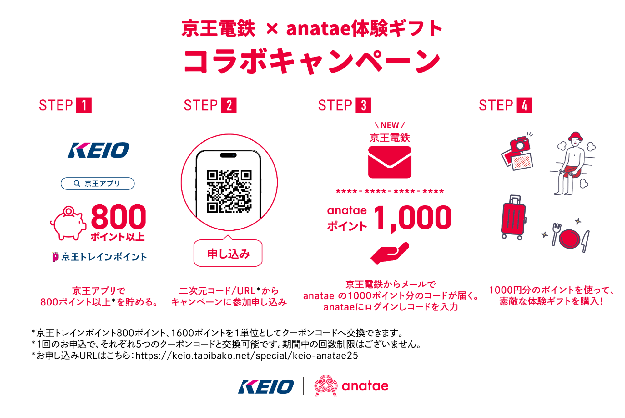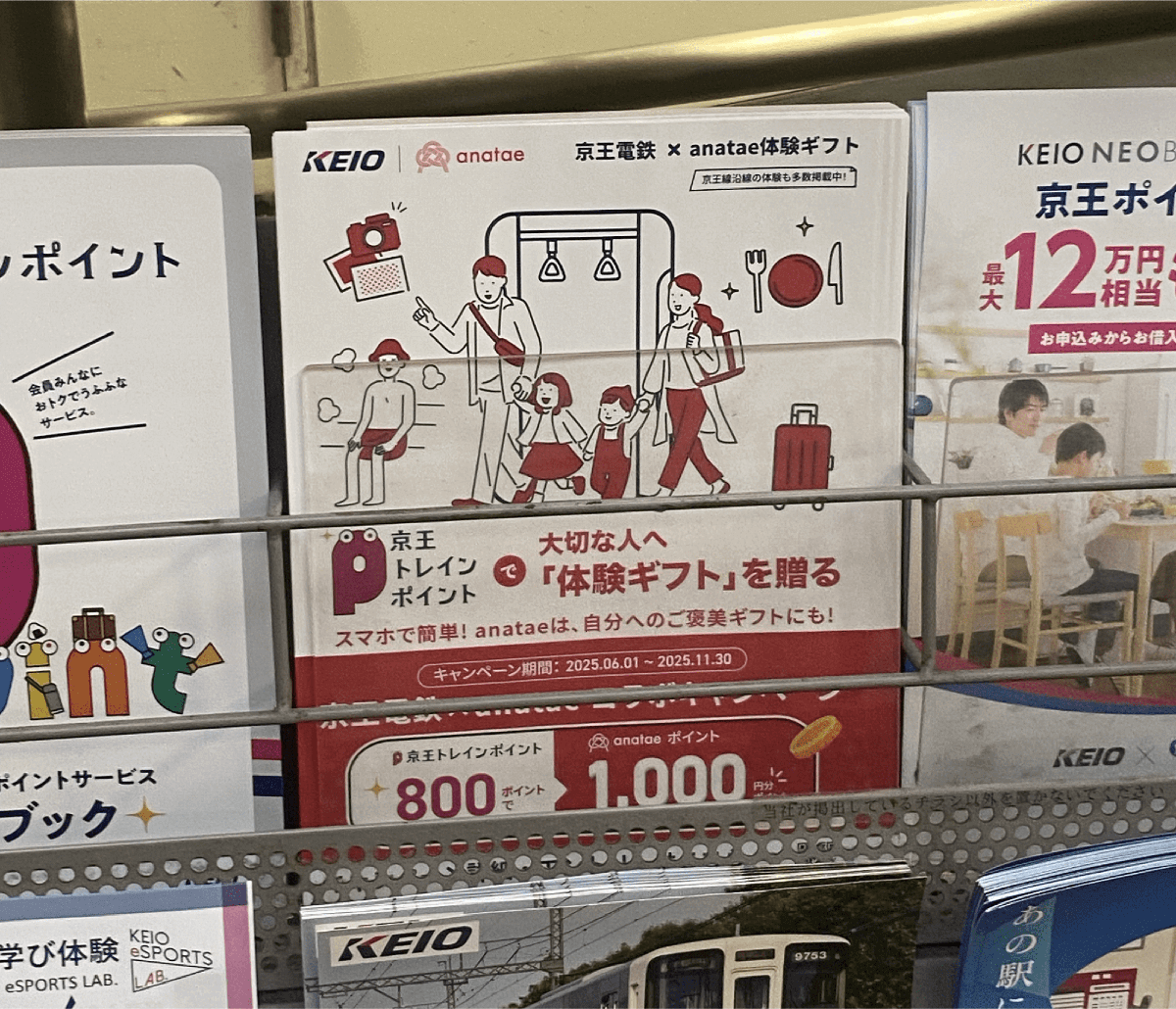 「京王トレインポイント」保有者は、800ポイントを一単位に、体験ギフト・マーケットプレイス「anatae」にて利用可能な「anataeポイント」に交換が可能です。今回は2025年11月30日までの期間限定で「京王トレインポイント」800ポイントを、「anataeポイント」1,000ポイント分に交換ができる、特別キャンペーンを実施いたします。「anataeポイント」 1,000ポイントは、「anatae」が提供するレストラン、宿泊、エステ、サウナ、映画鑑賞チケットなどの購入時に1,000円分としてご利用可能です。