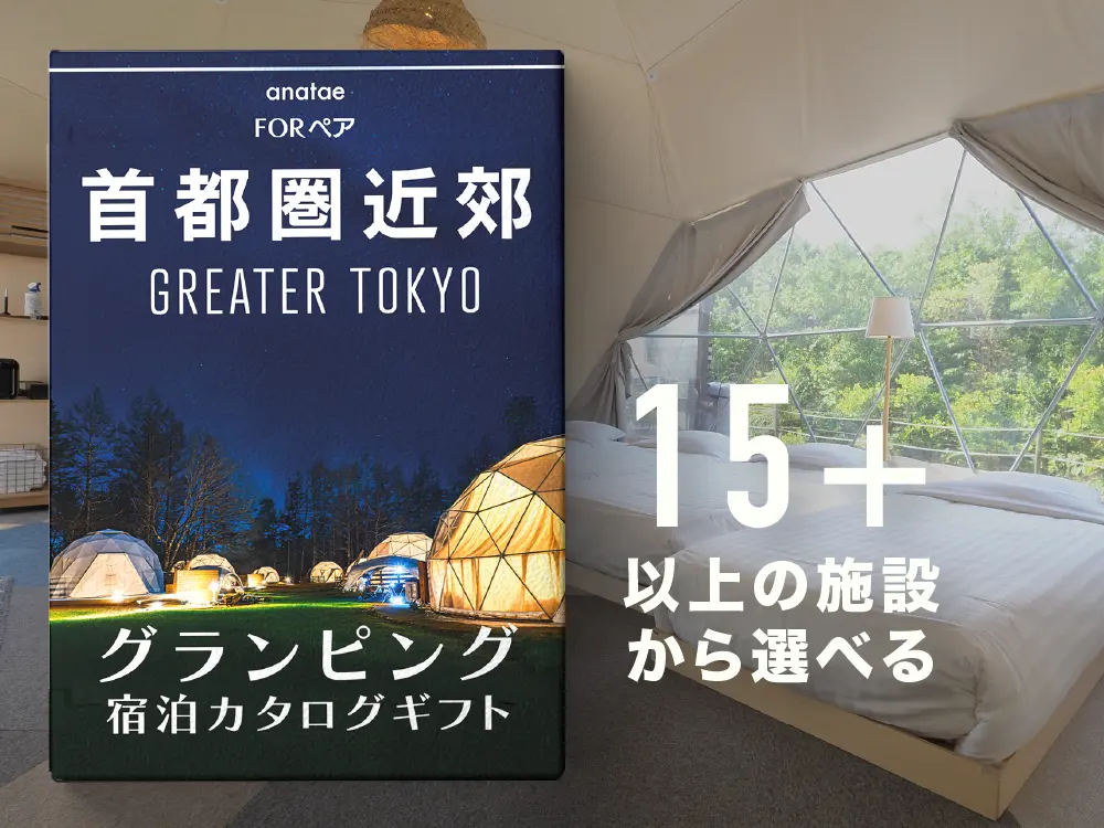 首都圏近郊の人気グランピング施設から宿泊先を選べる、ペア専用のカタログギフトは、50代の方にもおすすめの体験ギフトです。千葉・山梨・静岡などアクセス良好なエリアを中心に、自然を満喫できる個性豊かな宿が揃っています。